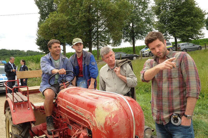 Während sich zwei Beamte (Komparsen, l. und 2.v.l.) im Hintergrund unterhalten, stellt Jo Stoll (Peter Ketnath, r.) ein paar Dorfbewohnern (Komparsen, M.) Fragen zur Toten. Beliebt war sie anscheinend nicht.