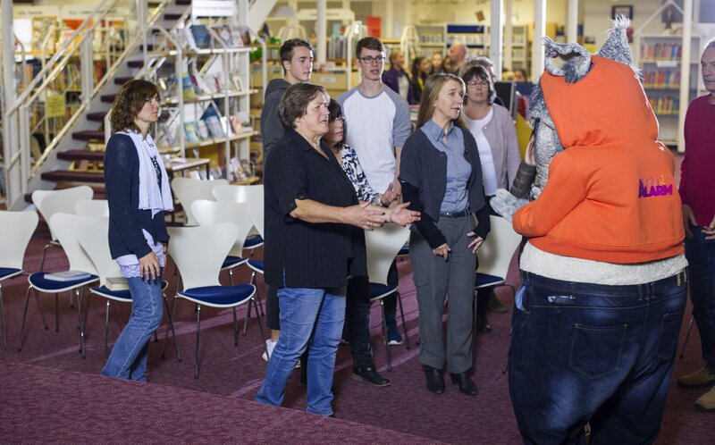 Auf der Straße vor einer Bücherei verliert eine junge Frau ein Buch mit dem verlockenden Titel "Tanzen". Zum Glück hat der TanzTapir das gesehen, hebt das Buch auf und eilt der Frau hinterher, natürlich auch, weil er denkt, dass der Titel des Buches bestimmt was mit der Bücherei zu tun hat. Weit gefehlt, in der Bücherei wird nicht getanzt, sondern nur gelesen und das in größter Stille. Nicht nur, dass keiner mit ihm tanzen möchte, zu allem Überfluss erzeugen seine Schuhsohlen einen komischen Sound - zwischen Gummigequietsche und Pupskissen. Jede Bewegung eine Ruhestörung. Die Büchereibesucher rasten aus. Singa und die TanzAlarm-Kids eilen herbei und bekommen Unterstützung von Kai, der zufällig an diesem Tag eine Lesung in der Bücherei halten soll. Mit vereinten Kräften sorgen sie für Ruhe auf der einen und für musikalische Bewegung auf der anderen Seite.