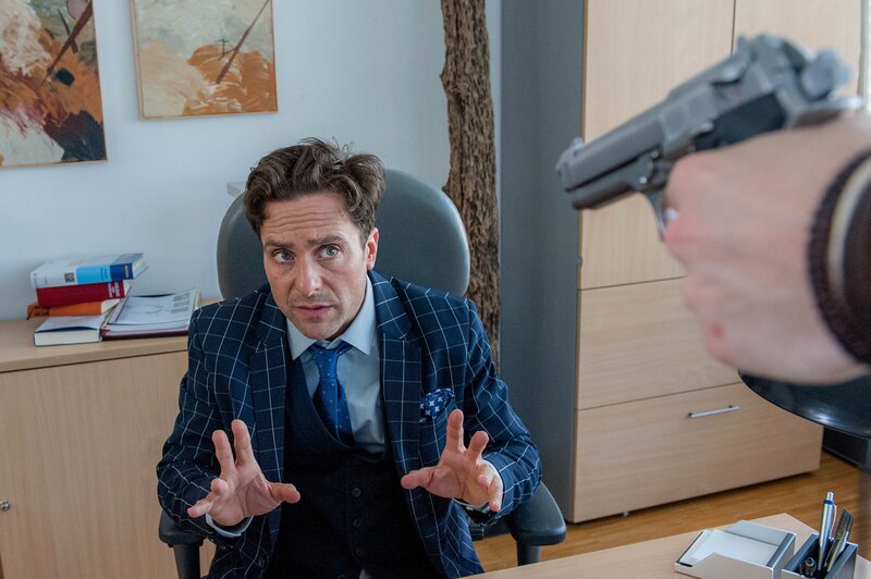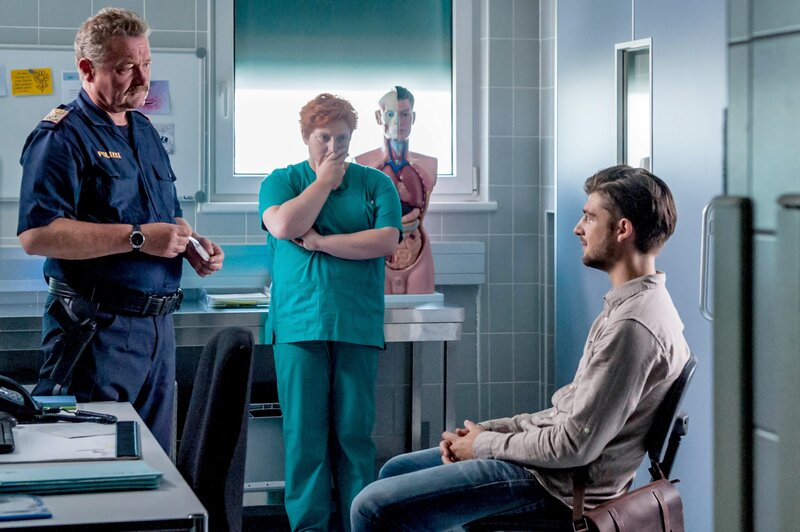 Laurenz Paar (Emanuel Fitz, r.) hat seine tote Freundin eindeutig identifiziert. Kroisleitner (Ferry Öllinger, l.) und Gerichtsmedizinerin Steffi Löcker (Veronika Polly, M.) sind teilnahmsvoll, haben aber noch Fragen.