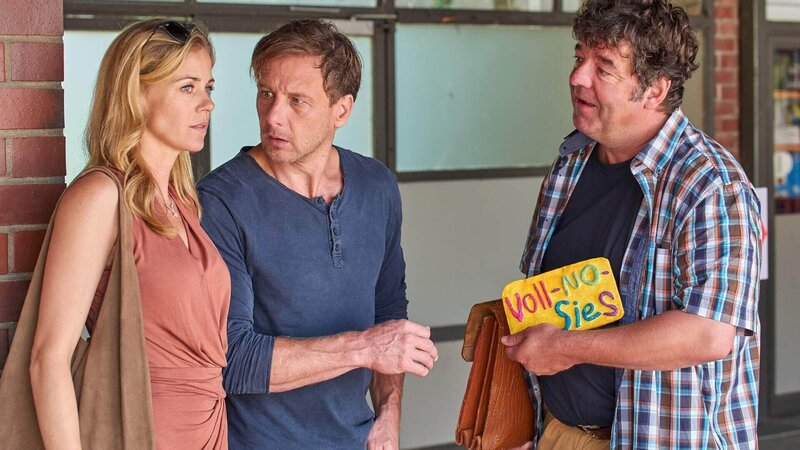 Nachdem sich Stefan Vollmer (Hendrik Duryn, M.) von Rose (Ulrich Gebauer, r.) einen Vortrag über Handysucht anhören musste, erteilt der Direktor Patrick (Eugen Bauder) den Auftrag für einen Medieninfoabend.