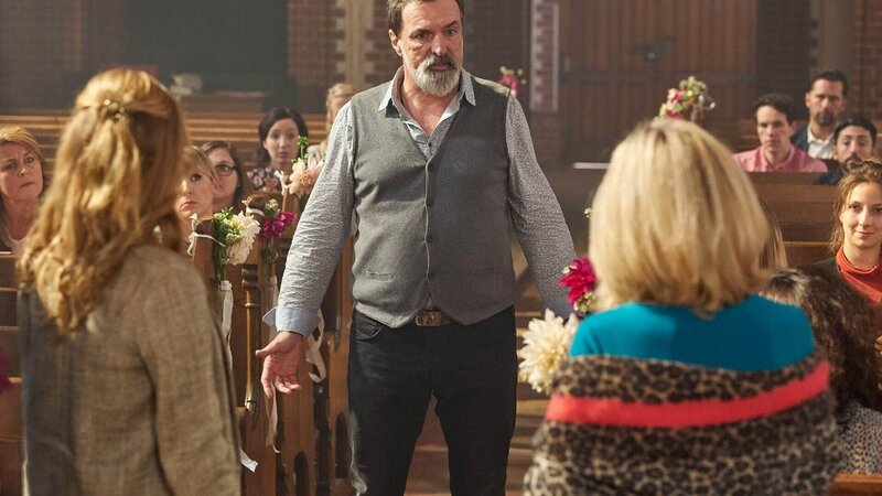 Karins (Jessica Ginkel, l.) Vater Walter (Andreas Hoppe) taucht unerwartet auf der Taufe seiner Enkeltochter Frida auf. Nicht nur Karin, sondern auch ihre Mutter Charlotte (Andrea L'Arronge) ist überrascht.