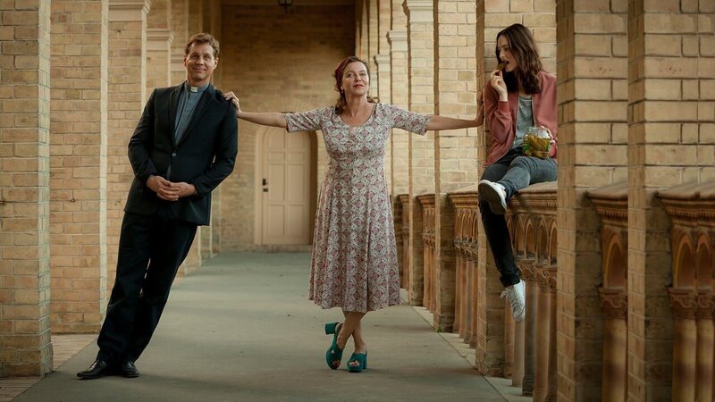 • Pfarrer Benedikt (Thomas Heinze, l.) hat eine sehr eigene Art, Amelie (Margarita Broich, M.) und Lou (Maria Ehrich, r.) Trost zu spenden. Amelie lebt auf, Tochter Lou findet es befremdlich.