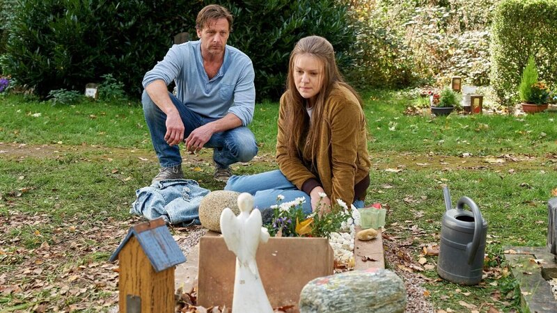 Stefan (Hendrik Duryn) ist mit Xenia (Merle Juschka) am Grab ihres Vaters.