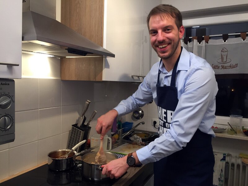 Marius' Menü: Vorspeise: Karotten-Kokossuppe mit Garnelenspießen Hauptspeise: Gefülltes Kalbsfilet mit Pfifferlingstomaten-Risotto und einer Tomatenreduktion Nachspeise: Himbeer-Panna cotta...