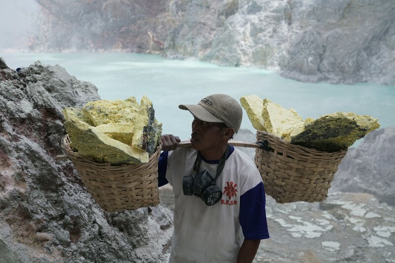 Bis zu 80 Kilogramm Schwefel trägt jeder Arbeiter der Schwefelmine auf dem Vulkan Ijen täglich ins Tal.