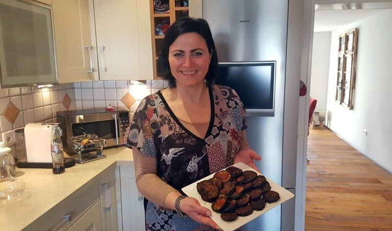 Evas Menü: Vorspeise: Variation von Antipasti: Gegrillte Aubergine mit Parmesan-Zucchini-Röllchen gefüllt mit Mozzarella und Schinken, gratinierte Muscheln mit Pinienkernen und selbstgebackenes Brot Hauptspeise: Selbstgemachte Tagliatelle...