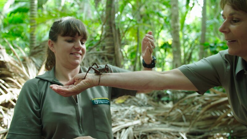 Die riesige Little Barrier Wetapunge auf Klettertour, auf dem Arm der Rangerin Leigh Joyce (re). Im Hintergrund die Försterin Nicole Toki.