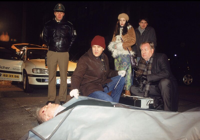 Ein Taxifahrer (Komparse) wurde von Nicole (Anna Frenzel-Röhl, Mi.) in seinem Wagen erschossen aufgefunden. Die Ermittler Dr. Duhler (2.v.li. Klaus Schindler) und Kommissar Kehler (Wolfgang Bathke, re.) treffen am Tatort ein und machen sich ein erstes Bild des Verbrechens.