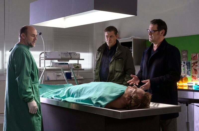• Pathologe Dr. Strahl (Christoph Tomanek, l.) teilt Finn Kiesewetter (Sven Martinek, M.) und Lars Englen (Ingo Naujoks, r.) mit, dass der Tote Patrick Hilgersen (Tom Radisch, liegend) Null-Komma-Null-Promille im Blut hatte.
