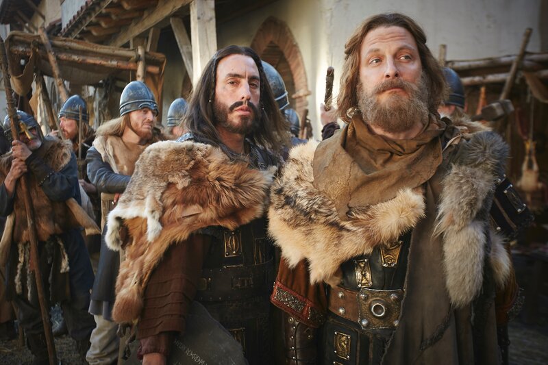 Germanischen Kriegern (Alexander Schubert, Holger Stockhaus) steht ein wichtiges Verhandlungsgespräch mit römischen Söldnern bevor.