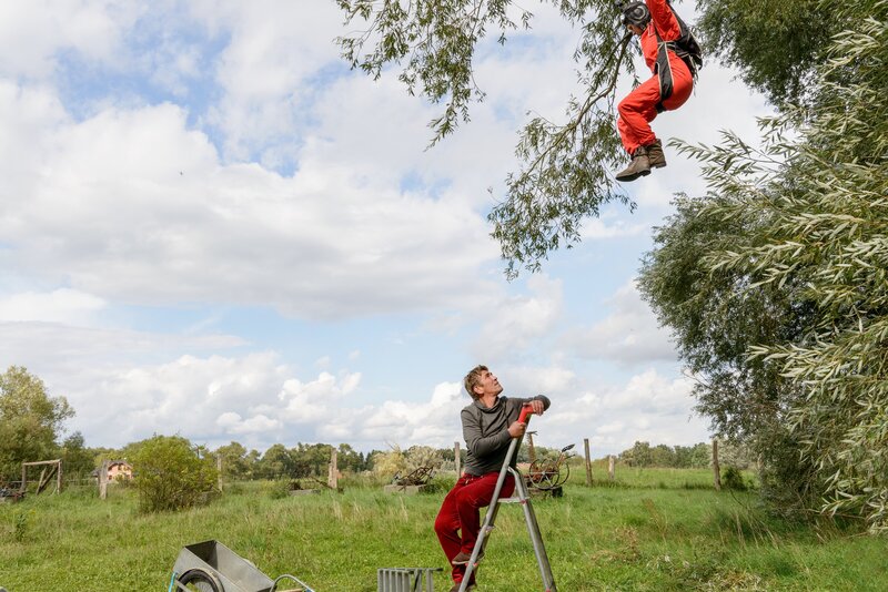 Fallschirm - Die verflixte Landung: Krach! Direkt über Fritz Fuchs und Keks landet Fallschirmspringerin Rosi unfreiwillig im Baum. Klar, dass Fritz alles versucht, sie dort aus der gefährlichen Höhe runterzuholen. Auch Rosis Neffe verfolgt sie mit dem Fernglas und will ihr helfen. Doch er verfängt sich mit dem Fuß in einem Rost. Fritz gelingt es währenddessen, Rosi zu retten. Mit einem selbst erfundenen Mini-Fallschirm macht er sich nun auf die Suche nach dem Neffen.