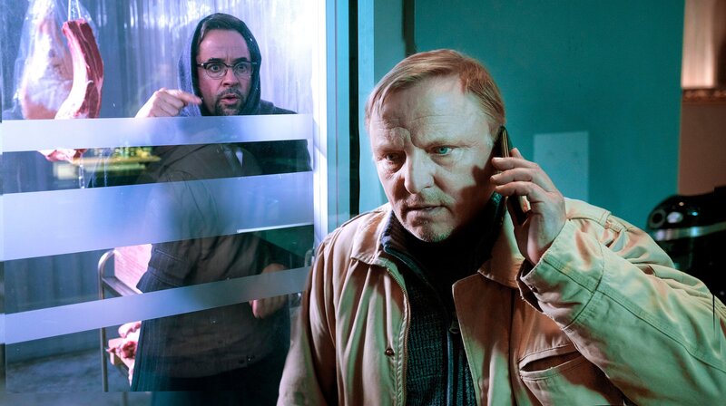 • Eiskalt: Prof. Boerne (Jan Josef Liefers, links) ist im Kühlhaus eingesperrt. Doch Kommissar Frank Thiel (Axel Prahl, rechts) hat erst noch ein dringendes Telefonat bevor er den Rechtsmediziner befreit.
