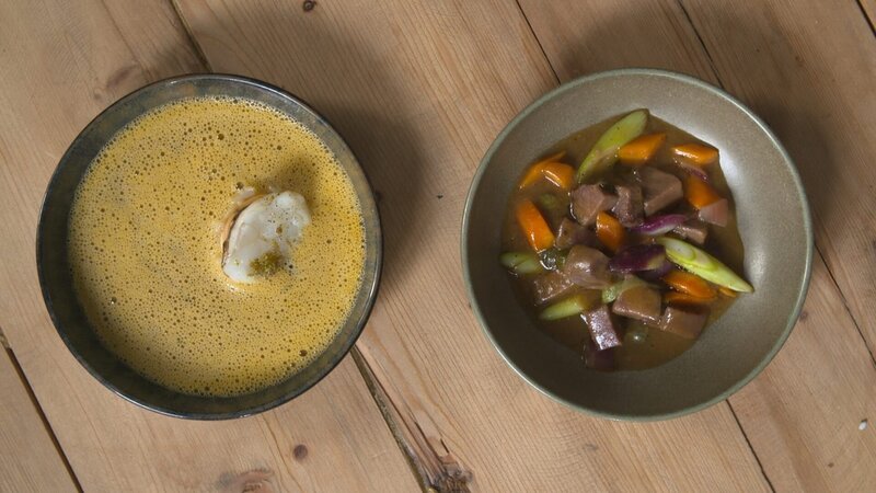 Alexander Herrmanns Version der Caldereta de Langosta (Langusteneintopf) und der Lengua amb Taberes (Schweinezunge mit Kapern)Bild: © ZDF