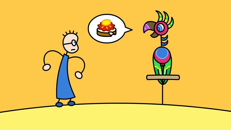 TOM trifft Papas Papagei und fragt ihn nach einem Erdbeermarmeladebrot mit Honig.