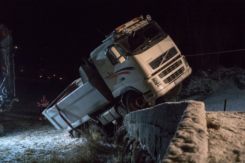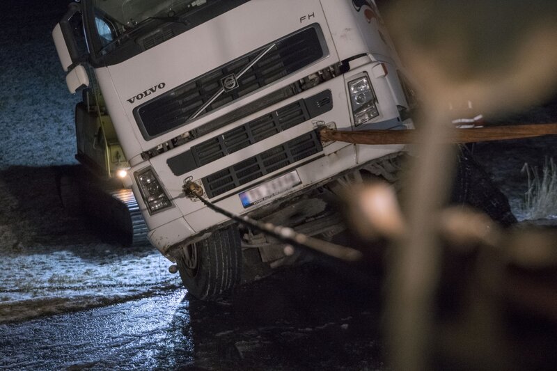 Odda, Norway - Truck attached to one wire and a strap. The truck is getting help up from the ditch. (National Geographic)