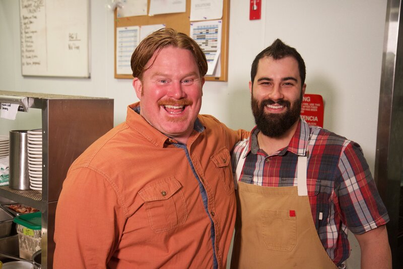 Host Casey Webb smiles with BeetleCat Executive Chef Andrew Isabella, as seen on Man v. Food.