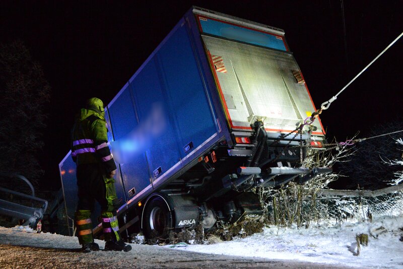 Overhalla, Norway - Snow plow tipped over. Roger Heggli attaching a wire to the plow.