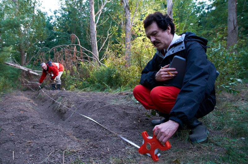 David Miller (Rob Trick, r.) und seine Kollegen untersuchen die riesige Furche, die die koreanische Maschine mit ihrer Tragfläche beim Absturz verursacht hatte und hoffen auf Hinweise für den Grund des Absturzes ...
