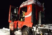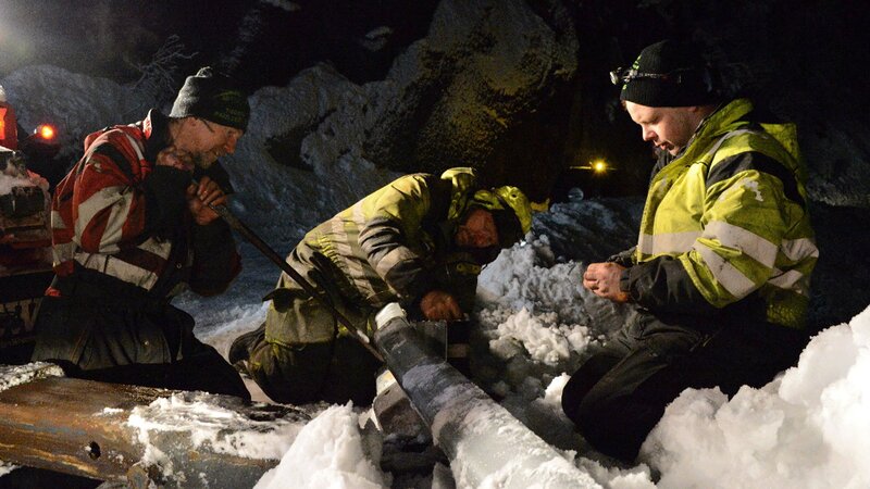 Ein Schneepflug ist eine Böschung hinabgerollt und auf einem zugefrorenen See zum Stehen gekommen. Die Rettungscrew muss extrem vorsichtig vorgehen, denn niemand weiß, wie dick das Eis wirklich ist.