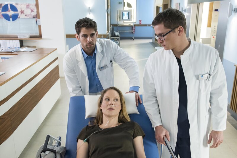 Carola Moltke (Tessa Mittelstaedt, l.); Dr. Elias Bähr (Stefan Ruppe, r.); Dr. Niklas Ahrend (Roy Peter Link, hinten)
