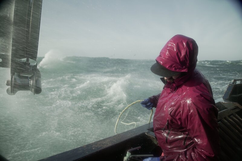 • Zack Larson, Engineer on the Brenna A, tries to dodge the spray of a messy sea.