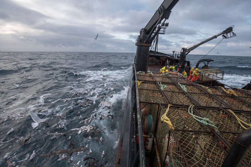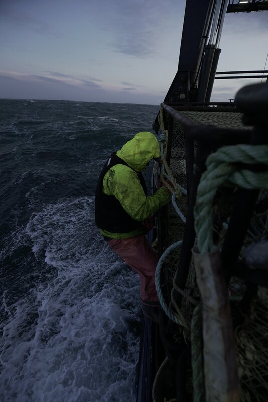 • A crew member on the Brenna A hangs off the side of the stack to tie pots off.