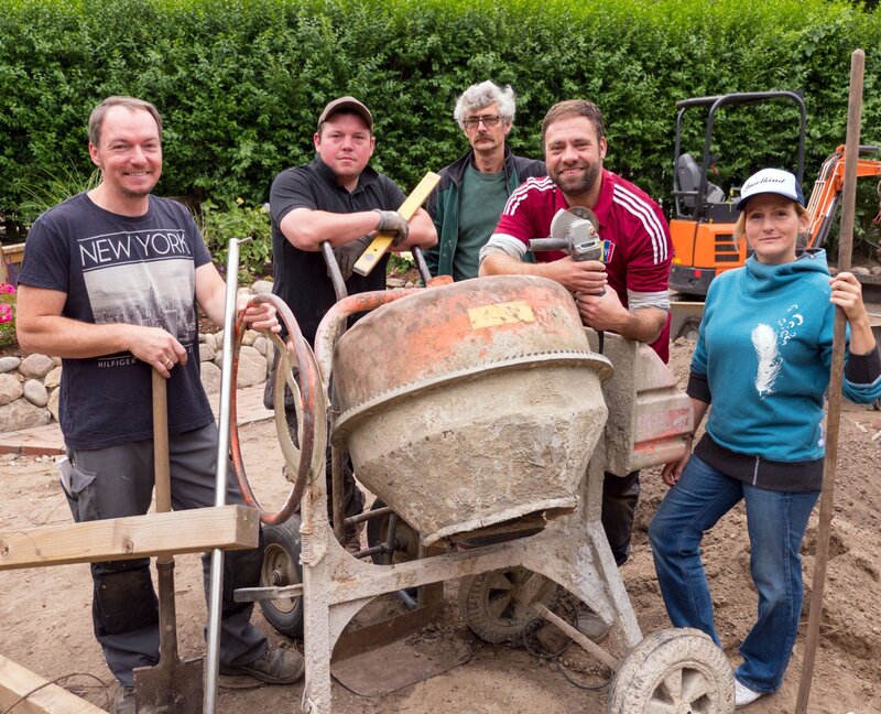V.l.: Henrik, Mina auf der Schubkarre, Claus, Marc, Denise und Ralf