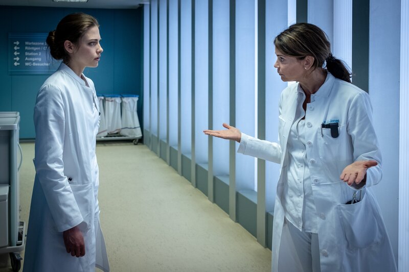 Dr. Jasmin Jonas (Gerit Kling, r.) ist sauer, dass Dr. Eva Grünberg (Laura Berlin, l.) sich nicht an ihre Anweisungen gehalten hat.