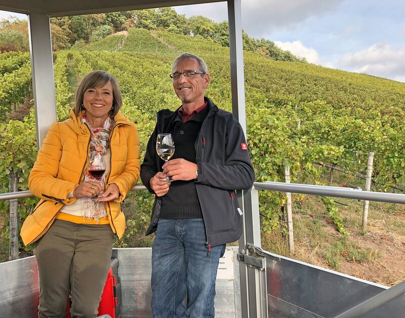 Moderatorin Annette Krause mit Rainer Lang, Vorstandsvorsitzender der Weingärtner Stromberg-Zabergäu.