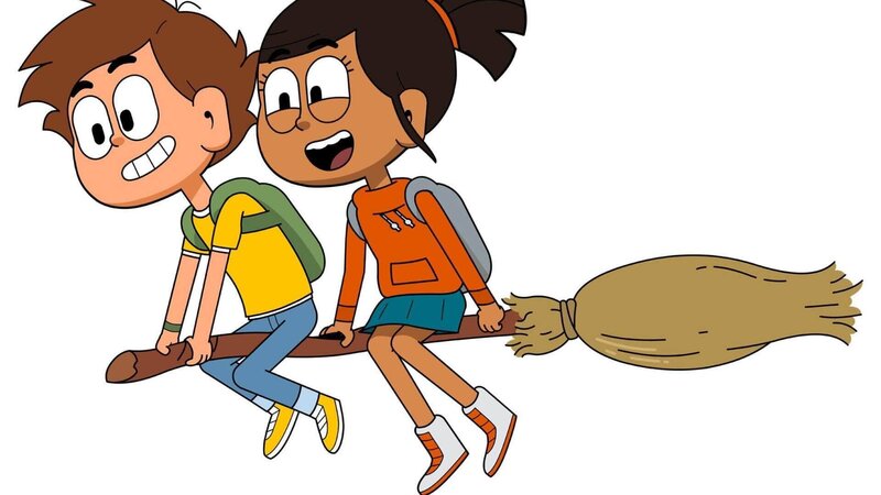 Mats (l.) und Malika auf einem Hexenbesen.