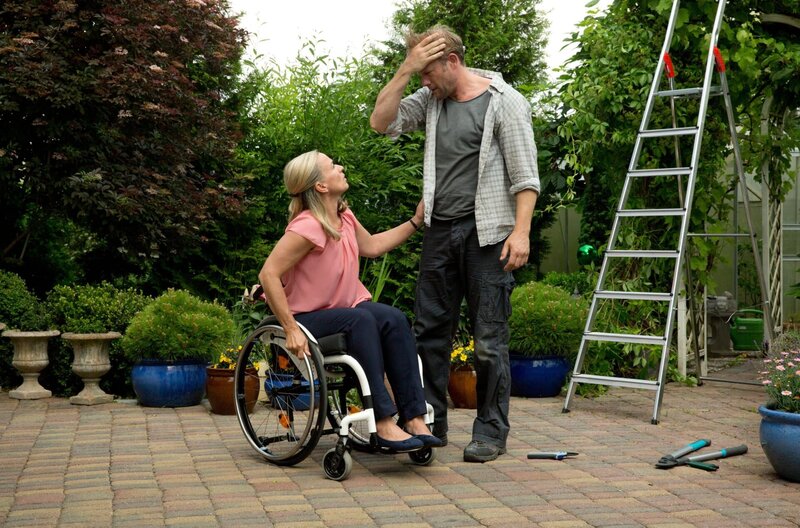 • Bei einem Sturz von der Leiter verletzt sich Martin Schneider (Hanno Friedrich, r.) an Schulter und Kopf. Seine Frau Silvia (Birgit Würz, l.) rät ihm, zum Arzt zu gehen.