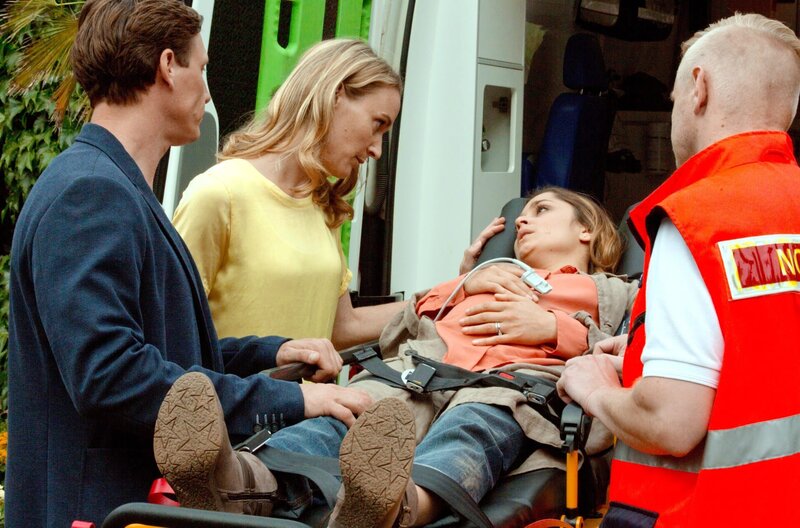 • Gero (Patrick Kalupa, l.) und Tanja (Christina Athenstädt, 2.v.l.) stehen Julia (Sarah Alles, 2.v.r. mit Komparse, r.) bei. Das Leben von Mutter und Kind ist in akuter Gefahr.