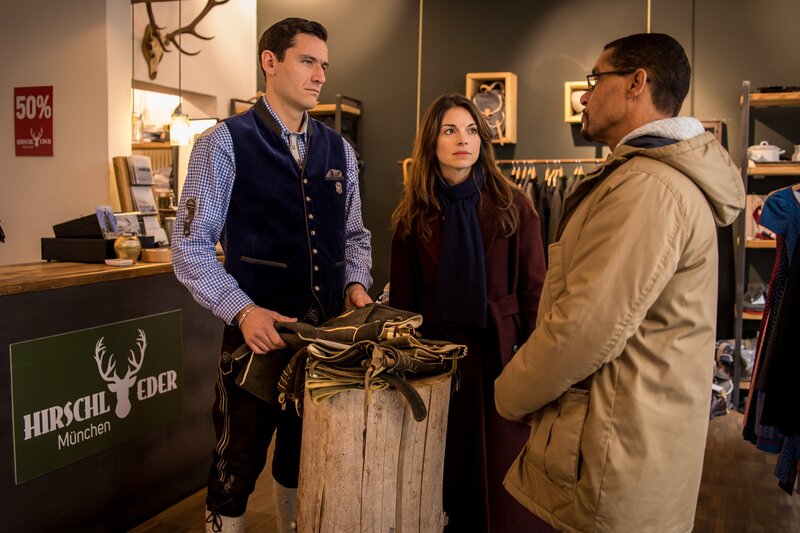 • Franz Ainfachnur (Christofer v. Beau, r.) und Katharina Hahn (Bianca Hein, m.) befragen Ludwig Eder (Michael Epp, l.) im Trachtenladen.