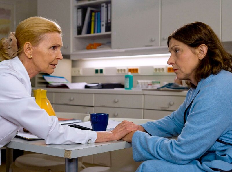Oberschwester Ingrid (Jutta Kammann, li.) versucht Renate Maisenbacher (Irene Rindje, re.) zu beruhigen und ihr zu erklären, dass sie bei einer so frühen Diagnose gute Chancen auf Heilung hat.