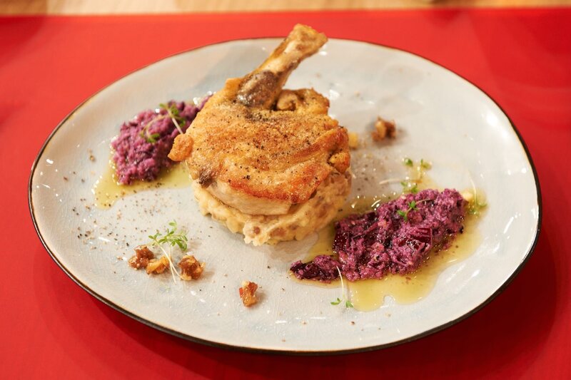 "Adventliches Leibgericht": Maispoularde mit Kartoffel-Maronen-Stampf und Rotkohl-Pesto von Leo Schulze-Vorberg.Bild: © ZDF und Gunnar Nicolaus