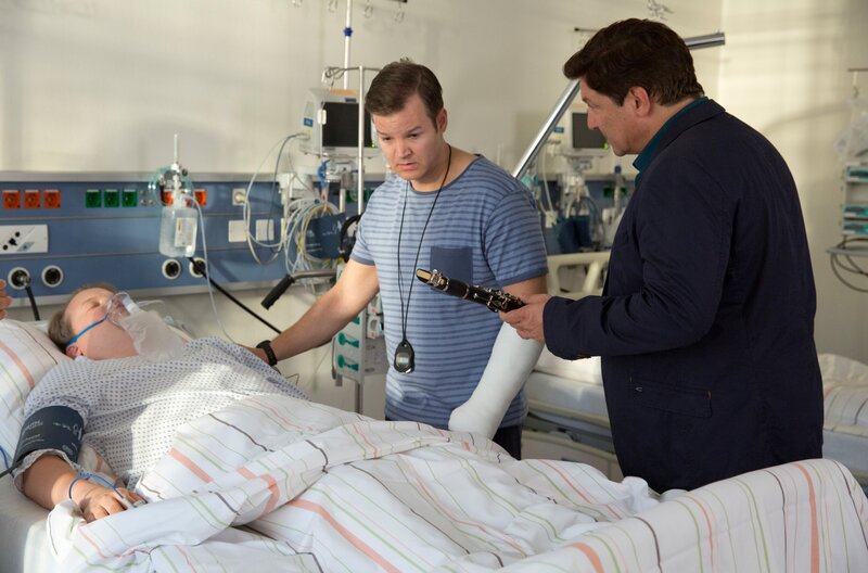 • Christian (Francis Fulton Smith, r.) erklärt Helge (Dominik Klingberg, M.), dass er Bodos (Roland Wolf, l.) Klarinette im Labor untersuchen lassen will.