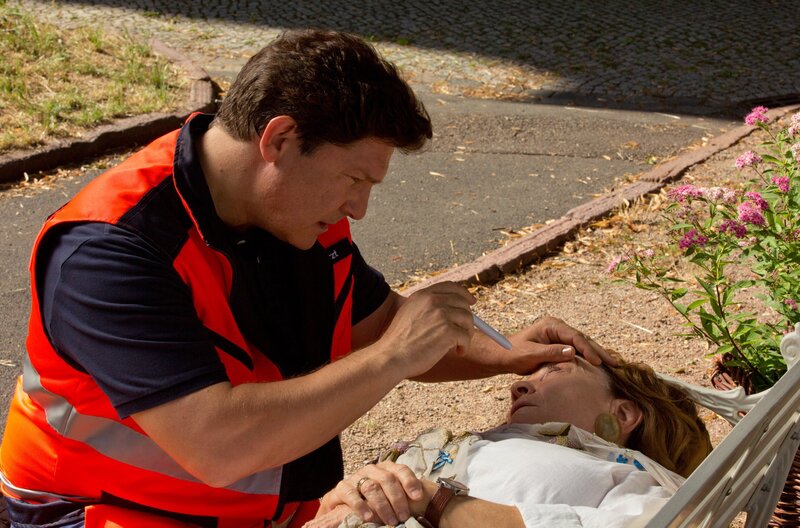 • Dr. Christian Kleist (Francis Fulton Smith, l.) untersucht die ohnmächtige Marta Kemmer (Barbara Focke, r.). Die alte Dame ist auf der Straße zusammengebrochen.