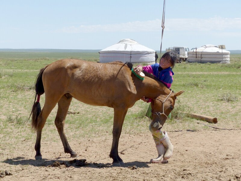 • Die tägliche Pferdepflege bei ihrem Lieblingspferd macht Erdene viel Spaß.