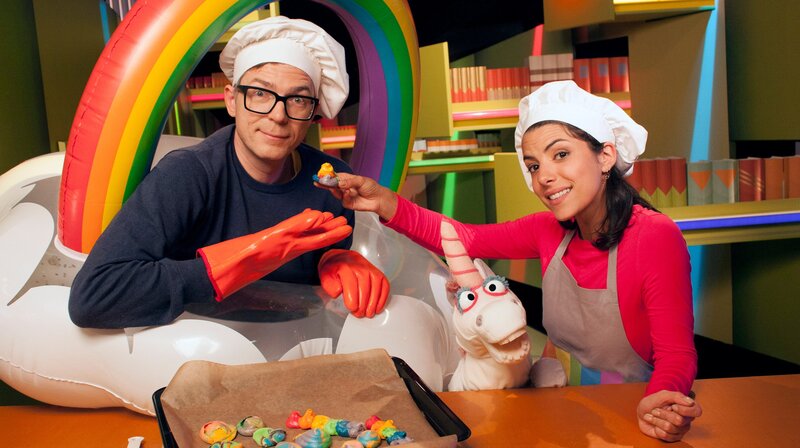 Magischer Besuch im Studio! Clarissa und Ralph bekommen in der Ah!-Küche Unterstützung von einem Einhorn. Heute gibt es nämlich Einhornhaufen. Ja, das was beim Einhorn hinten raus kommt, ist gar nicht eklig, sondern sehr schön bunt und zuckersüß. Und wie man Einhornhaufen auch ohne ein eigenes Einhorn herstellen kann, zeigen Clarissa und Ralph während sie sich z. B. diesem bunten Thema der Sendung widmen: Kann man bis zum Ende des Regenbogens oder in ihn hineinlaufen?