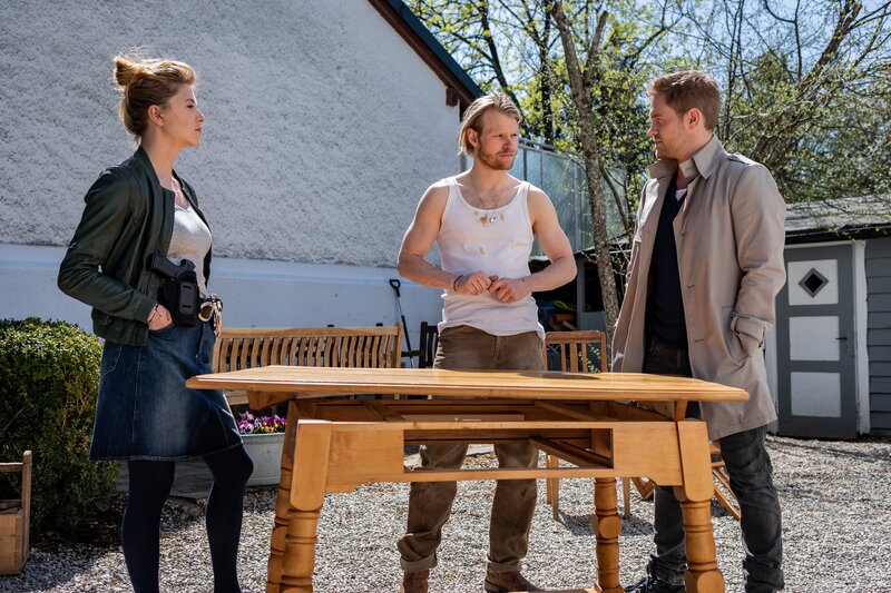 • Dominik Morgenstern (Joscha Kiefer, r.) und Resi Schwaiger (Mersiha Husagic, l.) befragen Urs Sinde (Lennart Lemster, M.) während seiner Tischlerarbeit.