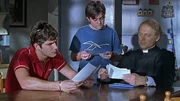 Pippo erzaehlt Don Matteo, dass er sich entschlossen hat, Polizist zu werden. (Francesco Scali, Claudio Ricci, Terence Hill, v.l.)