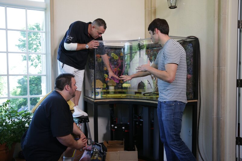 Dr. Oz's son Oliver is helping Wayde put gravel in the tank.