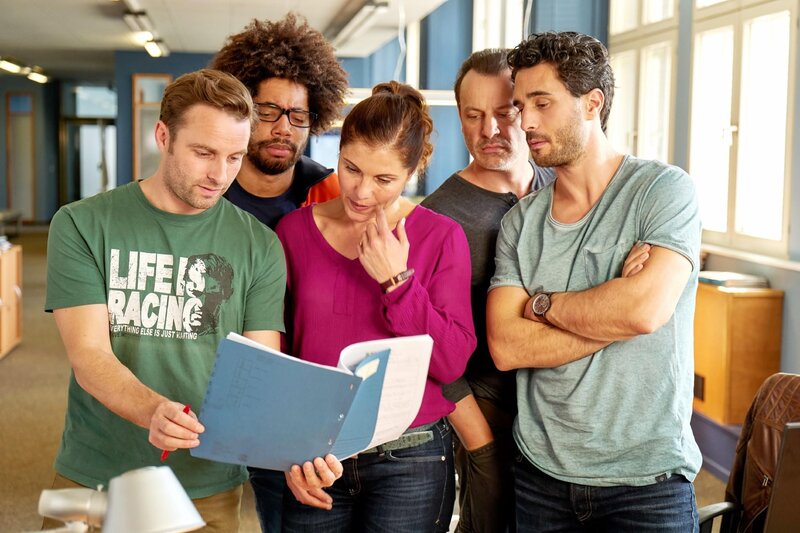 IT-Experte Ben (Julius Dombrink, 2.v.l.) hat den Code geknackt und Jan Maler (Jonas Laux, l.) von der KTU erklärt den Trick mit den Pillen. Polizeipsychologin Mina (Yasmina Djaballah), Hauptkommissar Thomas Waldeck (Jan Kittmann, r.) und Einsatzleiter Heller (Dirk Ossig) hilft das sehr.