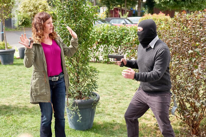Polizeipsychologin Mina (Yasmina Djaballah) wird von einem maskierten Mann (Michael Che Koch) mit einer Waffe bedroht.
