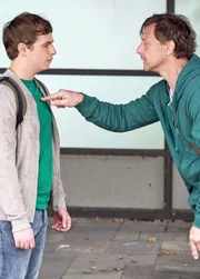 Die 16-jährige Mutter Lea (Louise Sophie Arnold) räumt nach einem anstrengenden Schultag ihre Sachen zusammen. Vollmer (Hendrik Duryn) hilft ihr dabei.