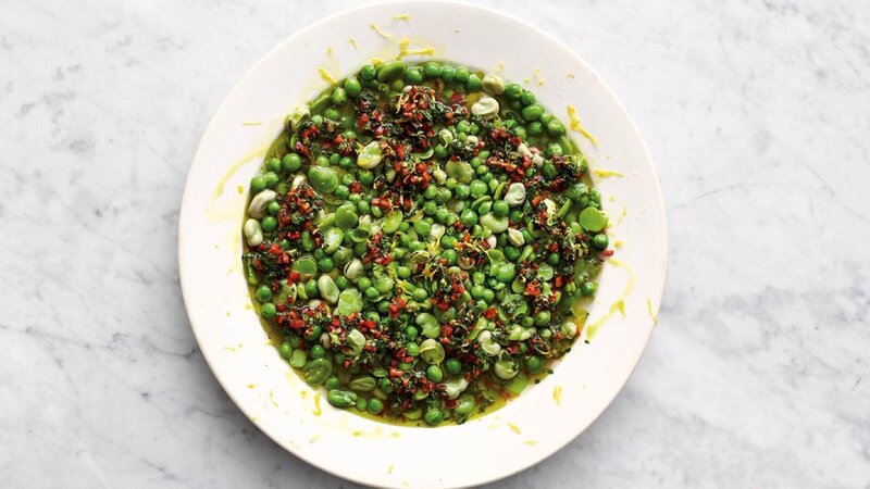 Alternativtitel: Feuriges Ofenpoulet, Erbsen-Bohnen-Eintopf und Beeren-Baiser