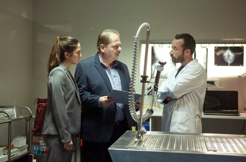 • Silva (Jürgen Tarrach, li.) und Marcia (Vidina Popov) bekommen von einem Pathologen (Tiago Fernandes) einen wichtigen Hinweis.