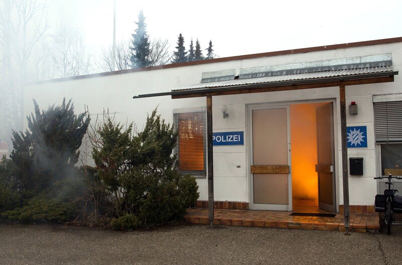 Sabine Kaier (Katharina Müller-Elmau, l.), Rebecca (Jeanne Goursaud, M.) und Riedl (Paul Sedlmeir, r.) sind fassungslos, das Revier brennt. Riedl versucht die Feuerwehr zu erreichen.