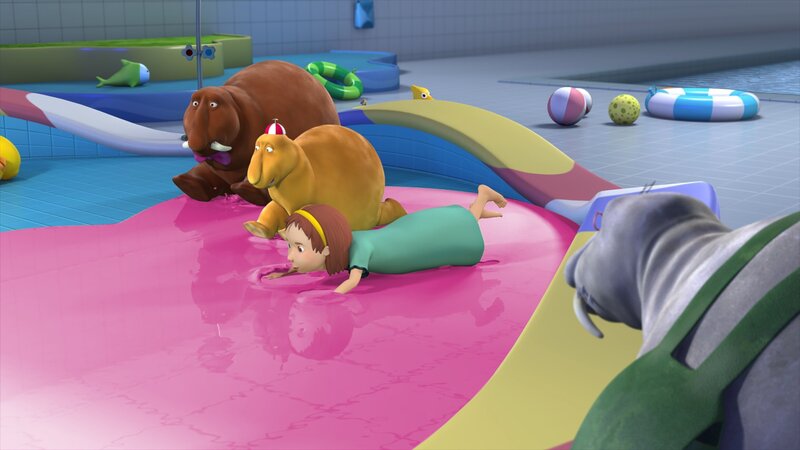 • Luzi hat ihr Seepferdchen gemacht und will den Moffels im Schwimmbad zeigen, wie man das Abzeichen erhalten kann.