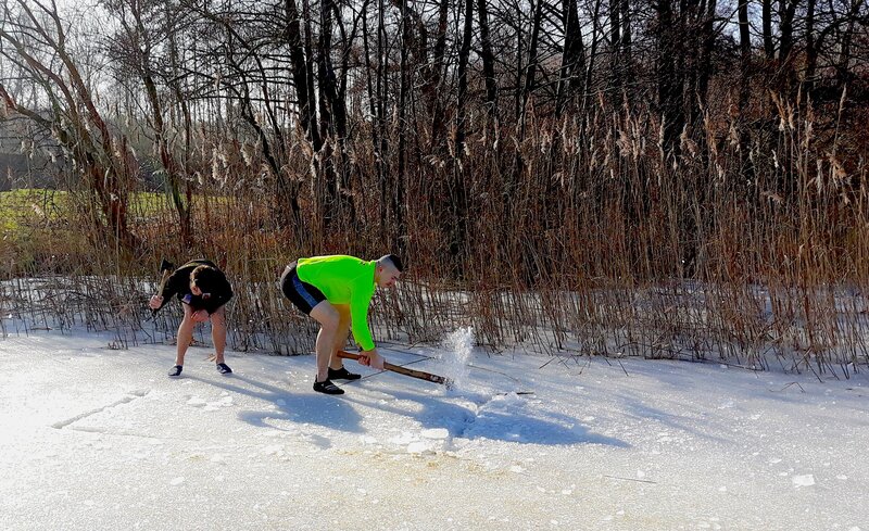 • Mikołaj und sein Vater hacken vor dem Baden ein Loch in das Eis des zugefrorenen Sees.